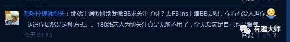 “那就注销微博去FB ins去呗,你看有没人理你,180线艺人为博关注真是无所不用了,拿无知满足自己也是服气”。