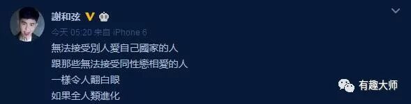 其后,29日5点他又发微博称,“无法接受别人爱自己‘国家’的人,跟那些无法接受同性恋相爱的人一样,令人翻白眼。如果全人类进化,那些人一定会先被淘汰”,话锋直指大陆网友。