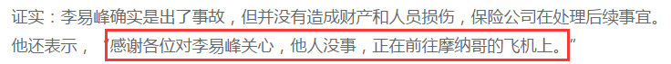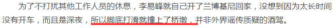 经纪人说,当时李易峰是第二天准备出国飞往摩纳哥工作,但是护照没有带在身边,为了不打扰其他人,就从车库开了很久没开的兰博基尼,没想到车技生疏,意外脚底打滑,就发生了事故。并不是酒驾哦
