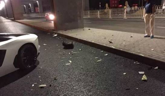 肇事现场一带一片狼藉,一辆无牌白色兰博基尼跑车呈45度斜停在路面,地面上满是碎块。大郊亭桥北侧的一处桥墩上,有剧烈的撞击及碰擦痕迹。