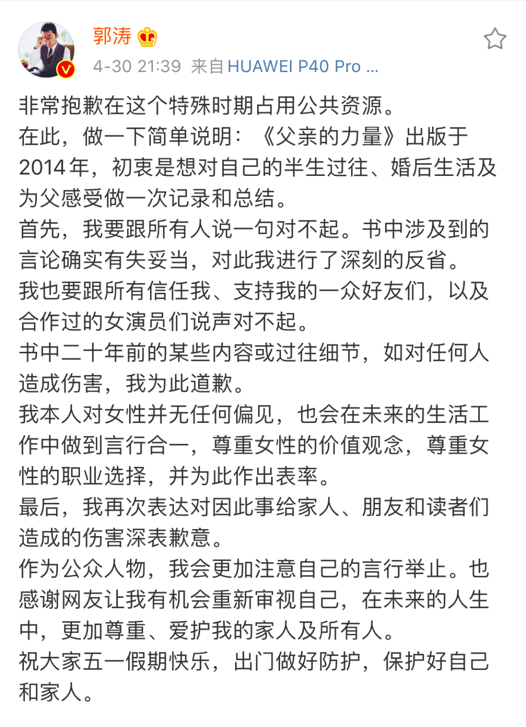 “最后,我再次表达对因此事给家人、朋友和读者们造成的伤害深表歉意。作为公众人物,我会更加注意自己的言行举止。也感谢网友让我有机会重新审视自己,在未来的人生中,更加尊重、爱护我的家人及所有人。”郭涛在道歉微博中表示。