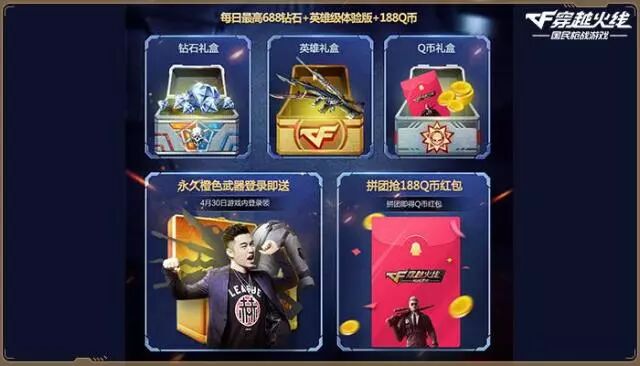 永久橙色武器+战地指挥官套装(永久)+陈赫角色(7天)豪华礼包430当天登录即送,更可领取200钻+AK角斗士体验宝箱。