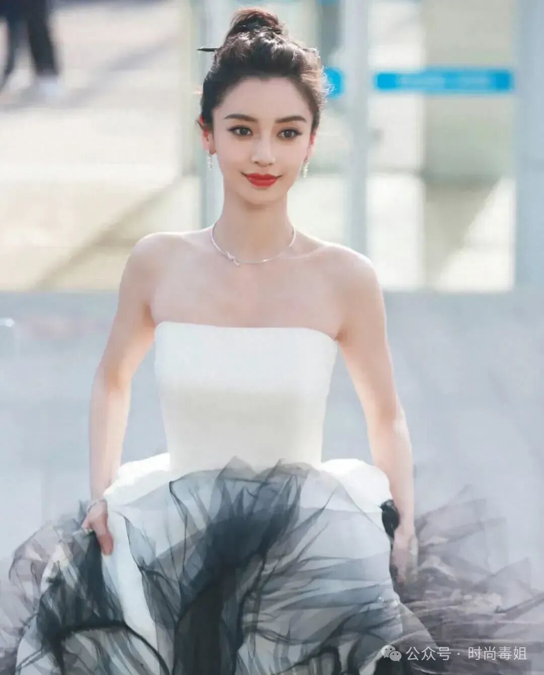 抹胸的款式显得特别高贵,裙摆设计得像只开屏的孔雀,特别吸引人。Angelababy为了摆好这个裙摆,可是费了不少劲,还差点儿在媒体面前闹出小尴尬。