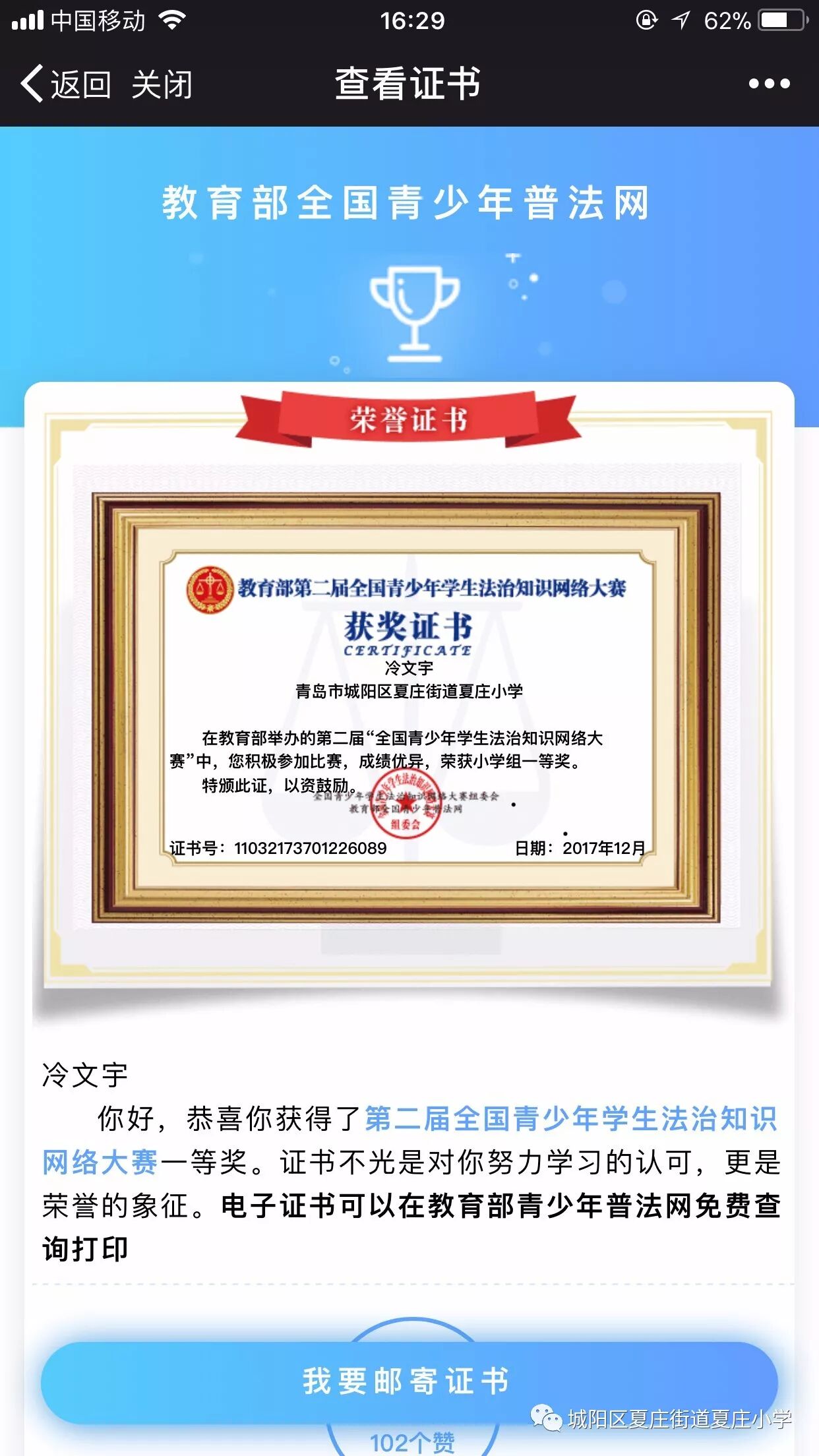 教育部全国教育普法领导小组办公室主办、教育部全国青少年普法网承办的“第二届全国青少年学生法治知识网络大赛”于2017年12 月31 日圆满落下帷幕。夏庄小学在本次大赛中获奖颇丰。