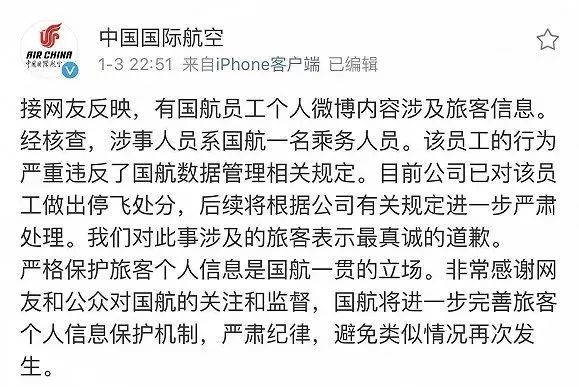通报称,接网友反映,有国航员工个人微博内容涉及旅客信息。经核查,涉事人员系国航一名乘务人员。该员工的行为严重违反了国航数据管理相关规定。目前公司已对该员工作出停飞处分,后续将根据公司有关规定进一步严肃处理。对此事涉及的旅客表示最真诚的道歉。