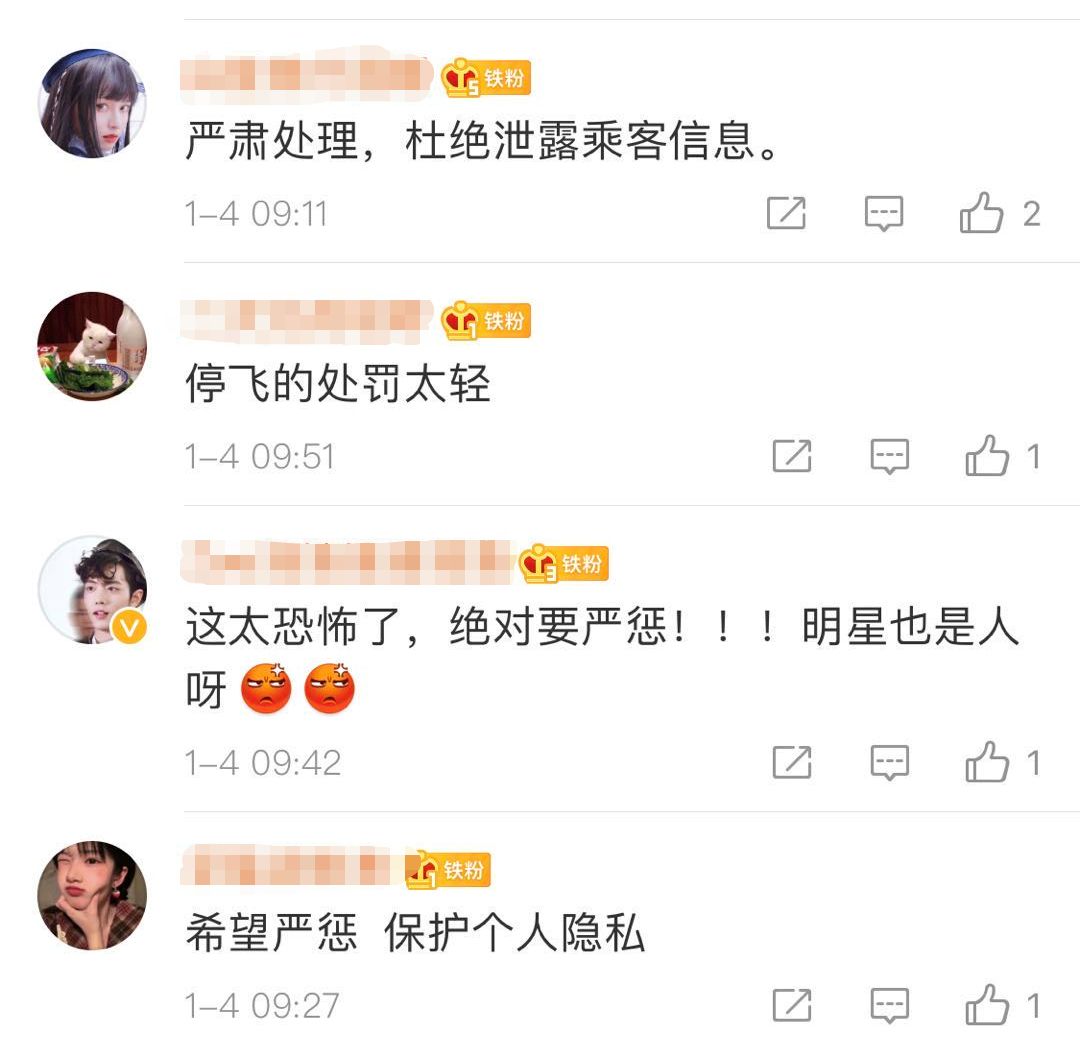 1月3日,有人举报称,中国国际航空的一名员工在微博上发布了多名演艺明星个人信息及乘机记录,包括井柏然、邓伦、白敬亭、周笔畅等人的生日、国籍、行程、常旅客状态等个人信息。