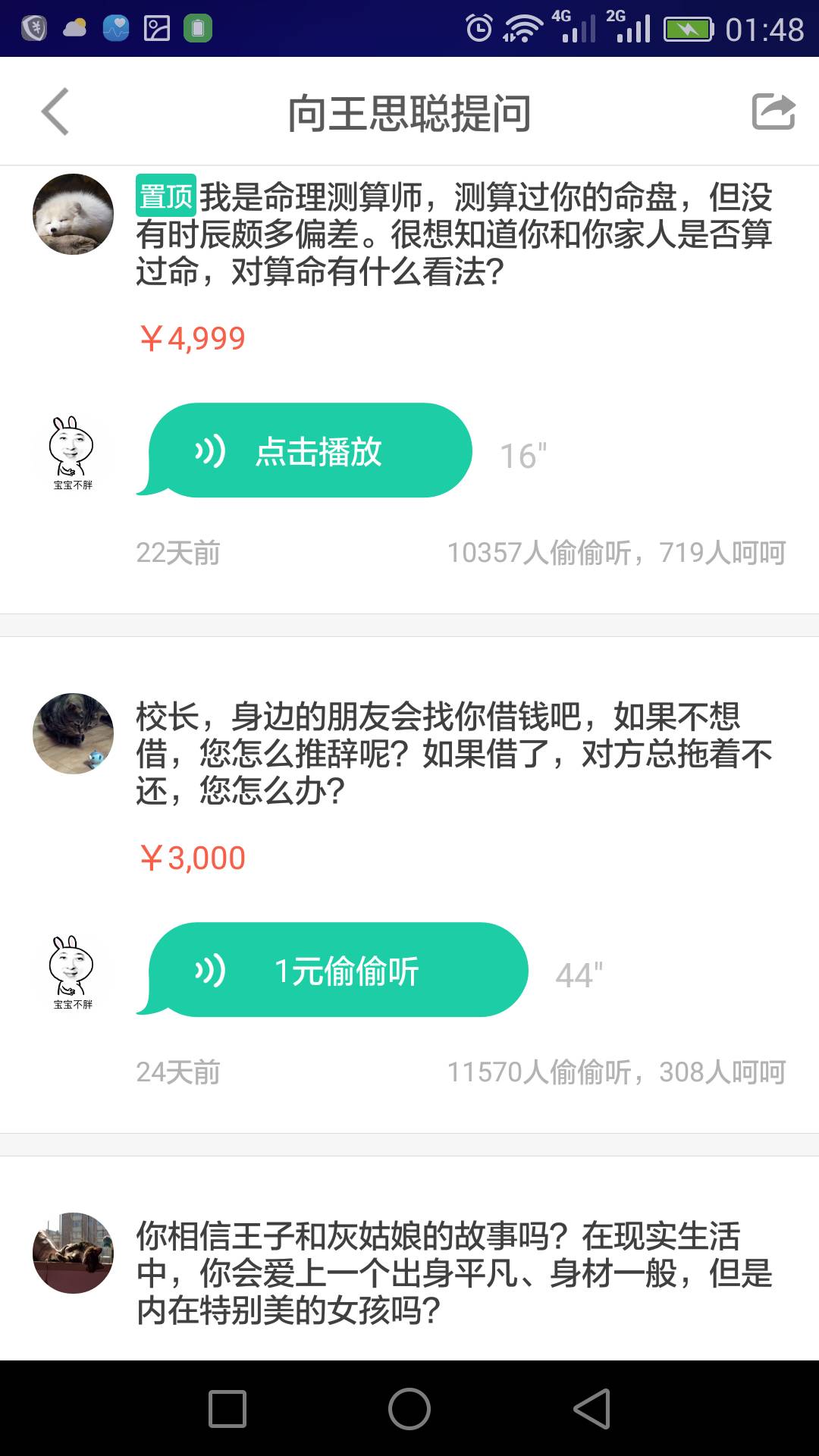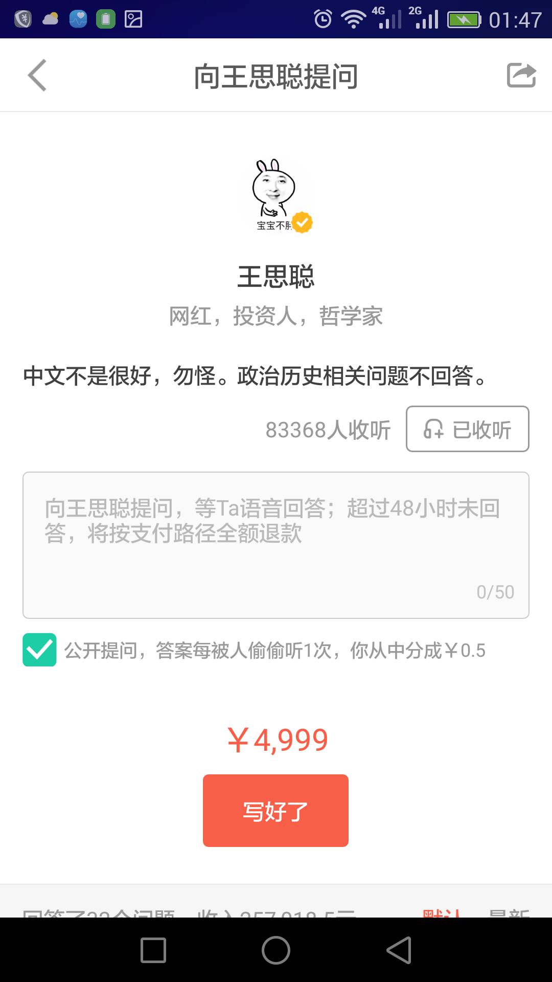 这个是王思聪的主页:提问一个问题高达4999,偷听的也多,你舍得花就会跟着赚钱了。