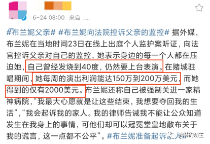 震惊,布兰妮悲惨半生,终恢复自由! 时尚大条 欧美女星 2021-11-19 17:55:46 787 创作不易,用心坚持,欢迎请BaGua喝几杯爱心咖啡!打赏并支持本文 打赏并删除本文 来源 | 武林的萌主(ID:thismeng)作者 | 林萌前不久,洛杉矶法官宣布布兰妮近14年的被监管生活结束,正式恢复自由。此后,所有财产都将回归她自己的账户,她可以自由地在自己的医疗、财务和个人生活上做出决定。回顾布兰妮的这半生,不得不由衷地为她叹一声恭喜,也为她这跌宕起伏的人生感到唏嘘。布兰妮是谁?当年的顶流歌手,被粉丝亲切地称呼为“小甜甜”,人生经历却跟名字截然相反。17岁的布兰妮凭一曲《Baby One More Time》大红大紫,马尾辫、学生制服的经典造型后来被各路明星模仿致敬。本以为,在爆火后,布兰妮会拥有让大多数人艳羡的生活,可她之后的生活却灾难性地崩溃了,经历了全美的荡妇羞辱,被逼塑造成“女疯子”,她毁的越厉害,别人就更开心。更别说父亲对她长达13年的监禁,操控,吸血。走红后,布兰妮的事业日益如日中天,得到了越来越多人的喜欢。布兰妮的名声开始遭受到重创,是从她的第一段恋情开始。男方是歌手“贾老板”Justin Timberlake,在外形上,两人看起来像一对金童玉女,也因此,事件一经公开就成了八卦媒体的关注焦点。然而好景不长,分手后,是满地狼藉,一出又一出的闹剧。男方新歌暗示是由于布兰妮出轨而分手,又一度在公众场合披露与布兰妮的私生活事件。这些重创了布兰妮的形象,让她变成了每个人口中的荡妇。然而事情并未经查证,却使得布兰妮的事业一落千丈。此后,在媒体的采访中,涉嫌性骚扰的问题越来越多,布兰妮已经与“荡妇”这个词挂钩。全民争先嘲笑她,媒体像吸血一般紧紧粘附在她身上,她越落魄,笑得越开心。不知道是不是因为这些事情的刺激,抑或是从小缺乏家庭的呵护,所以才急于在感情上填补空白。2004年,她与童年的好友闪婚,可是,仅仅55个小时候,这段感情就以失败告终,还赔进去了400万美元的身家。再度沦为笑柄。几个月后,布兰妮又和自己的舞伴步入婚姻,然而这个男人,却是个彻头彻尾的渣男。 为了和布兰妮结婚,不仅隐瞒了自己有个孩子,还有个正在怀孕的女友。婚后才暴露了本性,好吃懒做,不服正业,生活混乱,生活的开销都由布兰妮负责。布兰妮不堪重负,离婚后,男人还跟布兰妮争夺两个孩子的抚养权,借此索要天价抚养费。布兰妮一度崩溃,甚至公开剃头发,然而这却被认为是她精神出现问题的征兆。这时,他父亲趁虚而入,拿着不知道从哪搞到的精神鉴定书,向法院申请获得布兰妮的监护权。布兰妮长达将近14年的监禁跟控制,才刚刚宣告开始。1981年,布兰妮出生在美国乡下的一个小镇上。她的母亲是一位教师,父亲虽然做过建筑、厨师等工作,但因为他常年酗酒,事业一直不算成功,这就使得家中的经济状况一直十分堪忧。布兰妮的家庭虽然贫困,但她从小就表现出了艺术的天赋。那时候她每周都要和母亲一起去教堂,在4、5岁的时候,布兰妮就开始在教堂上演唱歌曲。也许是看到了女儿身上的天赋,布兰妮母亲开始用心培养她。对于这个并不富裕的家庭来说,培养一个学艺术的孩子是很吃力的,布兰妮的母亲说,“那段时间,我经常要拆东补西,才能维持生活。”对此布兰妮的父亲也很支持,但相比于布兰妮的前途,他更关心的是她赚钱的能力。据布兰妮透露,在父亲的监管下,她需要一周工作七天,一天工作10个小时,不工作就不能见孩子。为了24小时监护布兰妮,就连她换衣服都有人守在一边,她连吃份快餐都要经过父亲的同意,如果她稍有不从,父亲就会把她送到疗养院。此外,发烧40度仍然要坚持工作,每次演出前都要吃药,一旦想要罢工,就会被工作人员威胁,喂食精神药物。甚至子宫里被强迫装了一个节育器,因为她的父亲不允许她继续结婚生子。40岁才拥有人生的第一台平板。终于,形容枯槁的布兰妮终于被发现了不对劲。越来越多的人关注她的状态。形容憔悴,肉眼可见的疲惫。布兰妮也多次隐晦地提到了自己的处境。网友意识到了,在她的评论区留下“如果你需要帮助在的话,在下一条视频里穿黄色的衣服。”布兰妮照做了。网友让她眨眼,她也照做了。越来越多网友支持她,她也终于勇敢地迈出了那一步。于是,被监禁了近14年后的她,终于一纸诉状,将一直把她当做摇钱树的父亲告上了法庭。好在,布兰妮的呼声越来越大,也受到了越来越多人对她处境的关注。许多欧美明星还有超模们,都在社交媒体上集体发声呼吁:Free Britney!(解救布兰妮)粉丝聚集起来组织了解救布兰妮的活动。最终,微博词条#布兰妮正式恢复自由#上了热搜。将近14年的被监管生活终于向大众宣告了结束,全网沸腾。其实,回顾娱乐圈,类似于明星被亲属“拖进泥潭”的事情并不少见。毛晓彤爸爸上节目控诉毛晓彤,为的是获取5000万的赡养费。张韶涵母亲婚外情,拿着她所有的存款离家出走,并在她事业如日中天的时候,泼她脏水,污蔑她吸毒。这些人打着血缘的旗帜趴在儿女身上不停地吸血,压榨。好在阴霾过去,她们都终究迎来了艳阳天。 创作不易,用心坚持,欢迎请BaGua喝几杯爱心咖啡!打赏并支持本文 打赏并删除本文 感谢您的支持鼓励,我会继续努力的!文章地址:用户邮箱:打赏金额:USDT 请输入数字点击”去打赏“,即可进行打赏支持本文章哦 布兰妮 About the Auth