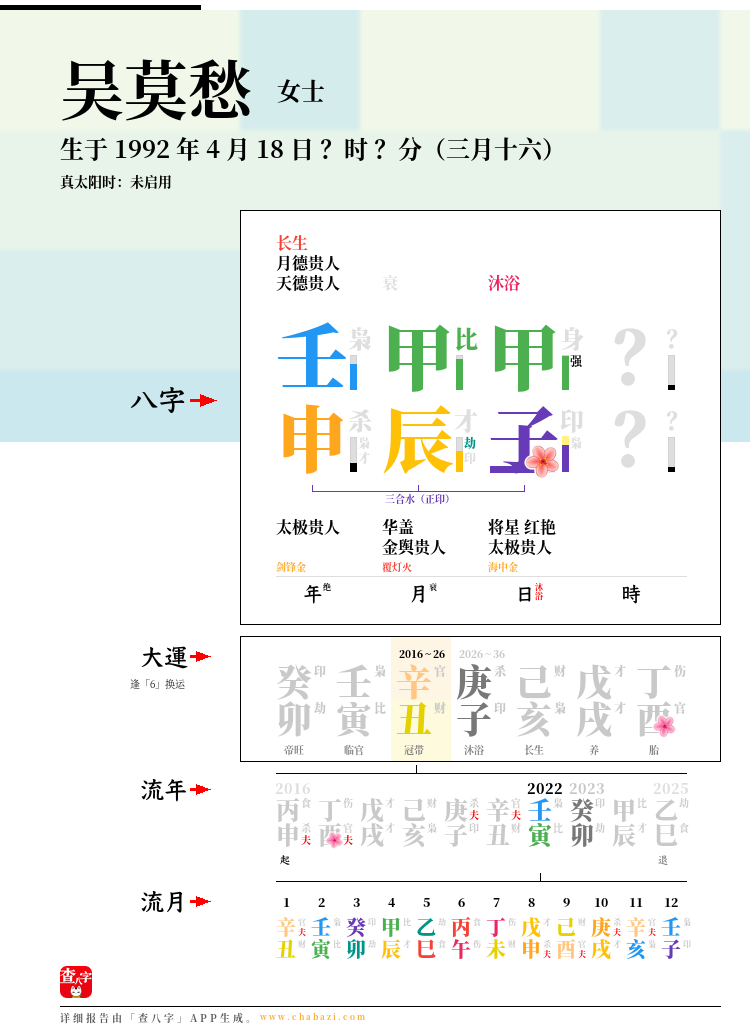 吴莫愁:少女壮志不言愁 力总说 内地女星 2022-06-16 18:18:29 1107 创作不易,用心坚持,欢迎请BaGua喝几杯爱心咖啡!打赏并支持本文 打赏并删除本文 力总为你研究天干地支周期规律,畅谈明星、名人与现代世界,了解过去、洞悉未来。(关注,然后加★星标)定制:专属于你的 7×24 VIP 实时运势 !!▲ 点击了解 图片仅用于事实报道,非代言图源:baidu 支持,请点「」。吴莫愁。2022 年夏天的《乘风破浪 3》,时年 30 岁的姐姐「吴莫愁」,在第一次公演的时候就被「淘汰」——她,落选的原因,不在唱功、不在舞姿,更不在演技或颜值,而是「人气不够」。图源:baidu至此,距她在 2012 年夺得《中国好声音》全国总决赛亚军的「辉煌时刻」,已过去了整整十年。曾几何时,她,能得到庾澄庆的力挺、拿下百事可乐等国际品牌的广告代言,几乎是拿到了「一手好牌」;但,这样的「好牌」,却在日后「命运」的波谲云诡之中,竟是被「打得稀烂」,人气、热度每况愈下,一直难以「翻身」……命理上看,她究竟遇到怎样的「变化」?她的,时间——图源:baidu 图片由「查八字」APP 提供扫码获取服务吴莫愁,生于 1992 年 4 月 18 日。八字:壬申 甲辰 甲子 ??。1992 年,吴莫愁出生于黑龙江省齐齐哈尔市。小学四年级时,她就被父母送去艺术学校,从此与「音乐」、「表演」,结下不解之缘。她的八字,最明显是地支出现「申子辰」三合水局,加之天干又透「壬」水,是十足的「水旺」。水旺,日柱又透「甲」,自然让人想起那句「水荡骑虎」——水,过旺,就会「水多木漂」;而这时的「甲」木,最好是能有「寅」来扎根,才不至于随波逐流、甚至迷失自我。那,吴莫愁的情形,则是她 2006~2016 这十年间,刚好是走在人生的第二步「寅」运——大运「壬寅」,将将好就是帮她实现了「水荡骑虎」——日主「甲」木,在「寅」运牢牢扎根,全盘「水清木秀」,两气成象而发达。图源:baidu在如此「寅」运极盛的中点,吴莫愁连续遇到两位「明师」:一位,是 2011 辛卯年,她考入沈阳音乐学院流行音乐系,师从「张楚格」(2006 年《超级女声》沈阳赛区亚军、全国第 20 名);另一位,则是 2012 壬辰年,她参加浙江卫视《中国好声音》选秀节目,遇到导师「庾澄庆」,更一举夺得全国总决赛亚军,从此「出道」。浙江卫视,及其「中国蓝」的视觉标签,是充沛的「水」象。奔涌而来的钱塘江之水(注:其卫视台标上的曲线为「钱塘江」,也即「浙江」的母亲河),对应吴莫愁八字中的「水旺」为「印」——主形象、传播,恰恰也是可以帮她「声名远播」。图源:baidu还记得:2012 年 9 月 30 日,是第一届《中国好声音》收官之夜,当时的流月在「己酉」,恰恰跟吴莫愁的月柱「甲辰」,形成绝佳的「天地鸳鸯合」——刚满 20 岁的吴莫愁,在那一天成为《中国好声音》的全国亚军,从此为全国的观众们熟知,并迅速「出道」。(注:虽然,她没能在那一晚得到全国冠军,而是输给了梁博,但能够得到全国范围的热度,也已经是一件非常幸运的事情!)2012 年,流年「壬辰」,天干透出「壬」水,是吴莫愁的「印星」——对于身强命格来说,「印」本是见忌;但,吴莫愁因在「寅」运,可以「水荡骑虎」,实际是凑成水、木「两气成象」,即便再多的「水」(印),也都是可以笑纳其中,充分享受她那「年少成名」的胜利滋味。图源:baidu2013 年,流年「癸巳」,流年不但透「癸」水,更有「巳申合水」,继续催旺她的「印星」——这一年,吴莫愁不仅发行了个人单曲(EP),赢得全球华语榜中榜「最具人气能量歌手奖」等称号;更以一首励志的《就现在》,成为百事可乐(PEPSI)的广告代言人之一,与郭富城、蔡依林、罗志祥、黄晓明等巨星齐名——可谓「少女得志」,她迈出的第一步就是「平步青云」。(注:百事可乐,以其蓝色的饮料包装,当然也是一个强烈的「水」象。)视频源:tencent直到今天,再回顾吴莫愁当年为百事可乐演绎的那一支《就现在》的 MV,不管是她的唱功、舞姿,还是 MV 本身的制作精良程度,在当年都是「首屈一指」的国际先锋级水平。据说,吴莫愁在那一年的广告代言费用,已是「身价过亿」。但,当时所有人都没有料到的是,吴莫愁 2006~2016 这十年的「寅」运,在她 2011 辛卯年达到极盛的中点,和 2012 壬辰、2013 癸巳连续两年透「印」过后——到 2014 甲午、2015 乙未年,已经开始走起了「下坡路」,大运之「寅」逐渐退行,直到 2016 年再次「换大运」。图源:baidu就音乐专辑而言,2014、2015 年的吴莫愁堪称「高产」:两年间,她连续推出 3 张个人专辑《无所不在》、《90》和《接近无限》。这样的高节奏输出,本身已经显得有些「急促」;而从专辑的名字上,「90」试图成为 90 后一代的「象征」;「无所不在」、「接近无限」,又显得极其巨大、抽象,仿佛是她「申子辰」水局那样「无边的海洋」——无边、无限,是「空间」膨胀到极致,也是她「印旺」到一定程度之后,真性情的表达。而问题,也就在于:2006~2016 这十年的「寅」运,吴莫愁因为「水荡骑虎」,可以承受这样的「印旺」——水多而木有根,水、木两气成象,能天下扬名于钱塘江上(浙江卫视);但,一旦她的周期,无情地迈过 2016「换大运」的时间节点,她的「寅」就会彻底退运,而换入下一步崭新的「丑」运,也即 2016~2026 年的这一步大运「辛丑」。结果,又如何呢?查八字® APP图源:baidu 图片由「查八字」APP 提供扫码获取服务吴莫愁,生于 1