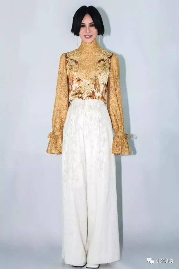 这件明晃晃的上衣真的很亮眼,金黄色的颜色视觉感强烈,然后在衣服中间两边还有两个相对称的图案,在袖口的地方又像是有条带子绑在袖口上一样的,这样看起来袖口的地方就很好看了。白色的裤子就把上衣颜色给减弱了几分,带有几分素雅。