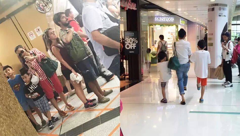 7.有网友晒出张柏芝与两个儿子排队等地铁的照片,长子Lucas已经长到妈妈肩膀高,小Q则一直搂着妈咪胳膊。还有母子逛商场的日常,三人身穿相似款的衣服十分有爱。