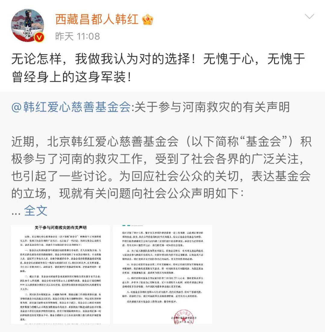 韩红本人转发基金会的声明,表示“无愧于心” 。