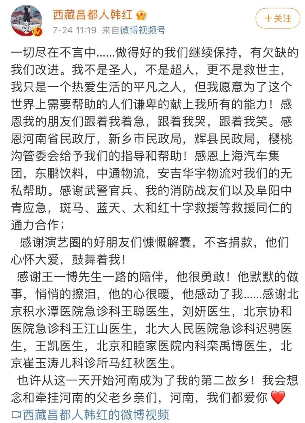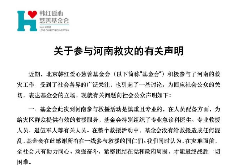 7月26日,韩红爱心慈善基金会发布“关于参与河南救灾的有关声明”,详细回应就人员配备、善款物资的用途以及蓝天救援队发布的博文等。声明强调,韩红并没有外界所传那般借用慈善提高自己的知名度,更没有谋取个人私利。
