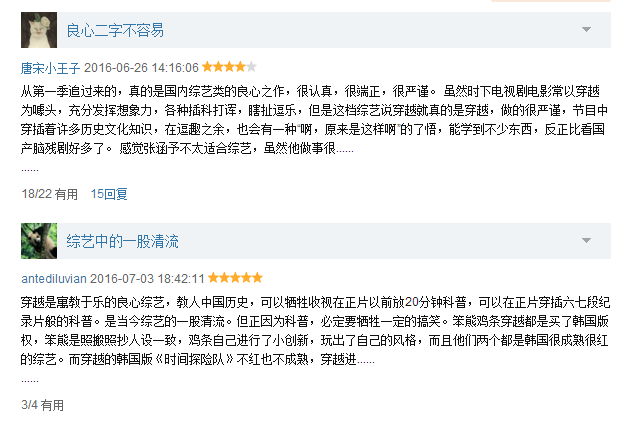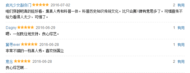 “是寓教于乐的良心综艺,教人中国历史,可以牺牲收视在正片以前放20分钟科普,可以在正片穿插六七段纪录片般的科普。是当今综艺的一股清流。”