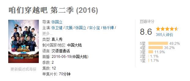 作为参考,《极限挑战》是9.1分,所以,《咱们穿越吧》的8.6分已经蛮高!