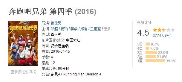 要知道……刚收官的《奔跑吧兄弟》第四季,口味很挑的豆友们都才给了4.5分……呃……
