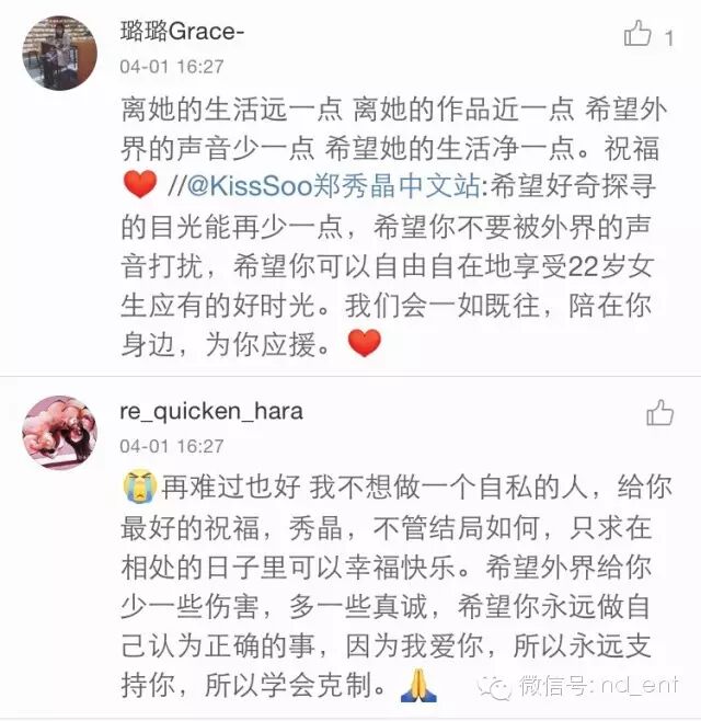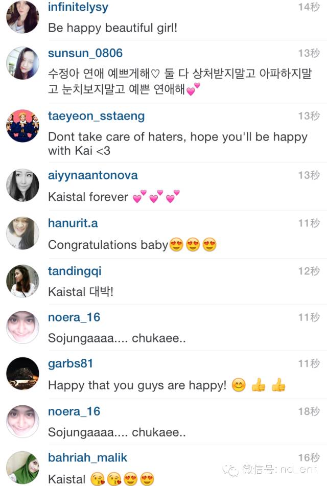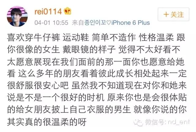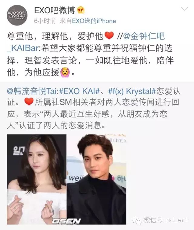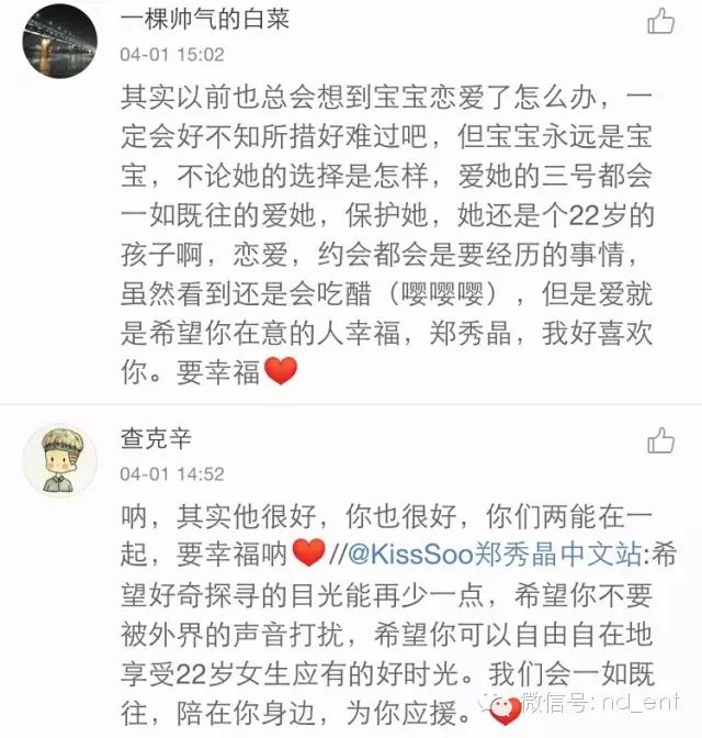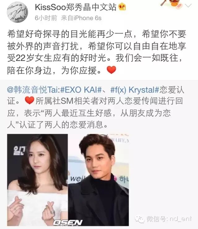郑秀晶&Kai,又一对颜值CP诞生了,但我很喜欢这一次饭... 日韩女星 2016-04-02 19:40:50 187 创作不易,用心坚持,欢迎请BaGua喝几杯爱心咖啡!打赏并支持本文 打赏并删除本文 南都全娱乐(微信号:nd_ent)原创作品,未经许可禁止转载。本文仅代表作者观点,不代表南都立场昨天是4月第一天,迟来的祝大家愚人节快乐!!大家被整了吗?或者向心仪的TA表白了吗?愚人节一到,大家对各种新闻的信任值也直线下降!比如邓文迪和普京恋爱的事好多人就觉得是愚人节特别策划。(不过据说这个新闻是当地时间3月31日爆出来的呢……)但是呢接下来这条新闻,绝对不是愚人节礼物!绝对不是!昨天早上睁开眼就开始刷微博的小王子着实被这一条新闻吓了一跳(还记得我的韩娱小透明属性吗哈哈哈):先给大家科普一下,Dispatch呢简称D社,就相当于韩国的“全明星探”,曝光明星恋情一抓一个准,一般被D社发图的恋情基本就没跑了。另外,这则新闻中的男女主角都是现在韩国炙手可热的偶像。KAI是大势男团EXO的成员,本名金钟仁,小王子也曾经提到过他,就是那个和泰吴宝宝一个饼印刻出来的哥哥!Krystal是大势女团f(x)的成员,本名郑秀晶,曾经饰演过《继承者们》里面刁蛮可爱的李宝娜,她还有一个特殊的属性就是——女粉丝很多。(f(x)的粉丝中的确女生占大多数~)她的姐姐也很出名,就是少女时代前成员Jessica郑秀妍。(郑氏姐妹超甜蜜!)大家不了解也没关系,反正重点是他们俩是同公司的,而且人气都非常高!小王子一脸懵逼,第一反应是:今天是愚人节,毕竟D社一直很调皮。但是点开图一看,这图也不像假的啊……于是小王子赶紧微信了全娱乐的另外一位小伙伴,Krystal的忠实迷妹嘎嘎!首先当然是要慰问一下她!(你们别怀疑我真的是在慰问!)原来忠实粉丝们都已经嗅到了女神恋爱的甜蜜了……(没错就是下面这个问题的回答)但对于女神的男朋友是KAI这一点她还是表示没有料到!而且女神突然恋爱了,心里空落落的……(准备买衣服压压惊)最后由于要撸论文,嘎嘎只能忍痛割爱把写稿的任务交给了小王子,让我们为这位迷妹默哀三秒。(我答应要带你出场的你是今天的主角!)D社爆出不久之后,KAI和Krystal的所属社SM娱乐公司也确认了两人的恋情。小王子知道各位迷妹的心都在滴血,但我还是要恭喜韩国又一对颜值CP诞生……!!(反正小王子觉得颜值高,口亨!)这个表情是为你们而放的……记得保存↑这么热门的偶像CP被拱上微博热搜也是正常:一般这种人气非常高的韩国爱豆被爆出恋情,都会引发一场饭圈大战,许多粉丝都会觉得自己心尖上的白菜被猪拱了。但是这次的饭圈画风,不仅让小王子感到意外,更令我感到暖心,因为相比尖酸刻薄的言论,理解和祝福更多。KAI的粉丝是这样说的:Krystal的粉丝是这样说的:小王子还专门到Krystal的Instagram逛了一圈,许多评论都是祝福。而在这些评论中,这一句尤其让小王子感动。我不会嫉妒你,我只觉得你幸运,请你帮我给他更多更多的爱。同样是1994年出生,还是练习生的时候他们就相遇了,经过了八年的相识相知终于走到一起。小王子觉得EXO一首叫《Girl x Friend》的歌就很适合他们(昨天被这首歌刷屏一天……):如果你能点头 或许一时难接受如果你能点头 我什么都愿意做如果你能点头 从此你在我心中不再是朋友 是女朋友想你想你 朋友笑我做梦故作洒脱却躲不过总被识破你不是我喜欢的style 我否认说故意说谎不让自己心思泄露忍着瞌睡传讯聊天 分享每个细节 孩子般嬉闹整夜曾经每天 这样每天你一直伴随在我身边他们正当青春年华,在这么美好的春天盛开了这么美丽的爱情之花,作为粉丝为什么要撒泼打滚痛哭流涕,而不能微笑着去祝福呢?粉丝们要做的应该是保护他们,不是放弃他们!因为你们的支持,一直是他们奋斗的动力。其实早在2014年就有这样一个帖子,详细分析了Krystal对KAI的喜欢。(大家有兴趣可以自己去搜!百度开晶吧!高甜!膜拜这位大神!)看完这个帖子,我才发现原来一直高冷怕生的郑秀晶也会主动和男生牵手,也会像普通女生一样对心仪的男孩小心翼翼。13年f(x)发新专辑时请来了KAI助阵拍摄专辑内页,留下了这样的画面。当被问及为什么请KAI来拍摄时,Krystal是这样回应的:而在被拍到的约会照片中,我们也可以看到,平时在舞台上魄力满满的KAI,对待Krystal却是细心温柔,男友力max:把自己的外套给女朋友穿,为女朋友开车门,开车送女朋友回家。KAI把自己的绿色格子外套给Krystal穿↑总之一句话:幸福就好!幸福就好!幸福就好!(重要的事情说三遍~)煽情的话说完了,我们当然要来看一些轻松的。首先入场的是水晶女神的迷弟魏大勋先生。大勋哥,你要挺住啊!(不好意思我笑了哈哈哈哈哈)另一位可怜人就是KAI的好兄弟(他们俩也长得很像……),同时也是Krystal的好友,SHINee的成员泰民。泰民、KAI、Krystal曾经合作拍摄过一组画报,值此Kaistal恋情公开之际,这组画报当然是要拿出来遛一遛了。泰民和KAI是从小一起长大的好朋友,关系好到去汉江边散步都会被D社偷拍。(D社真会玩……)Kaistal恋情公开后,泰民的站子也来煽情了一把,配乐非常有内涵啊:这画面不仅让小王子想起一句歌词:明明是三个人的电影~我却始终不能有姓名~(不要跟我纠结是一句还是两句OK?!)而小王子的万年好基友,曾经萌过KAI x 泰民CP的小胖君看到这组图,“如梦初醒”道:“ 以前看这画报的时候觉得郑秀