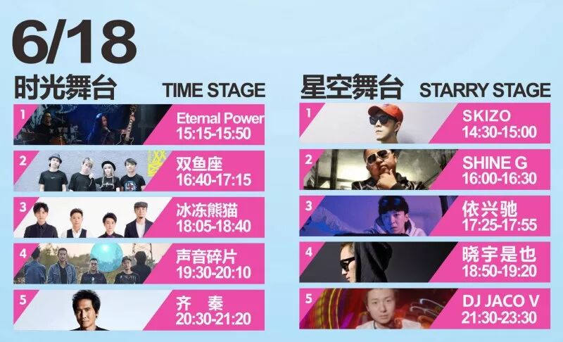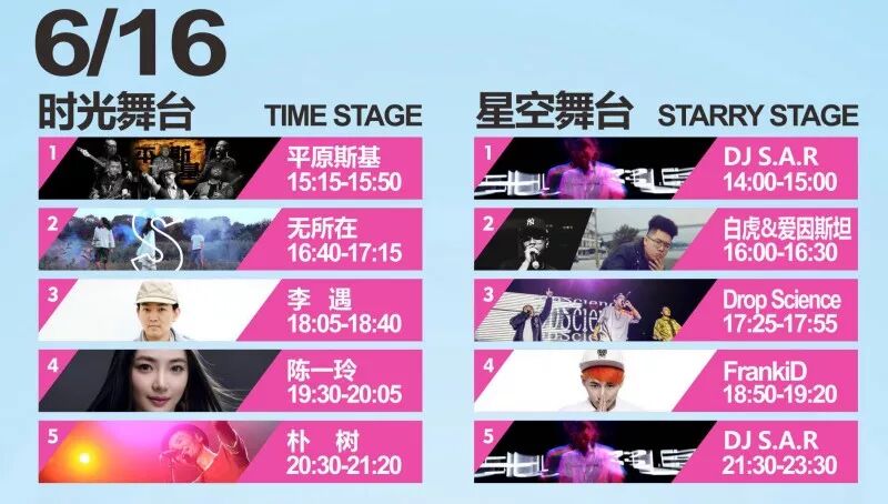 6月16日—18日,每天演出时间为下午14:00—23:30,时光舞台、星空舞台两个舞台同时进行。朴树、齐秦、郑钧、好妹妹、赵照、声音碎片、FrankiD、Csir等30余组歌手给你带来音乐盛宴。