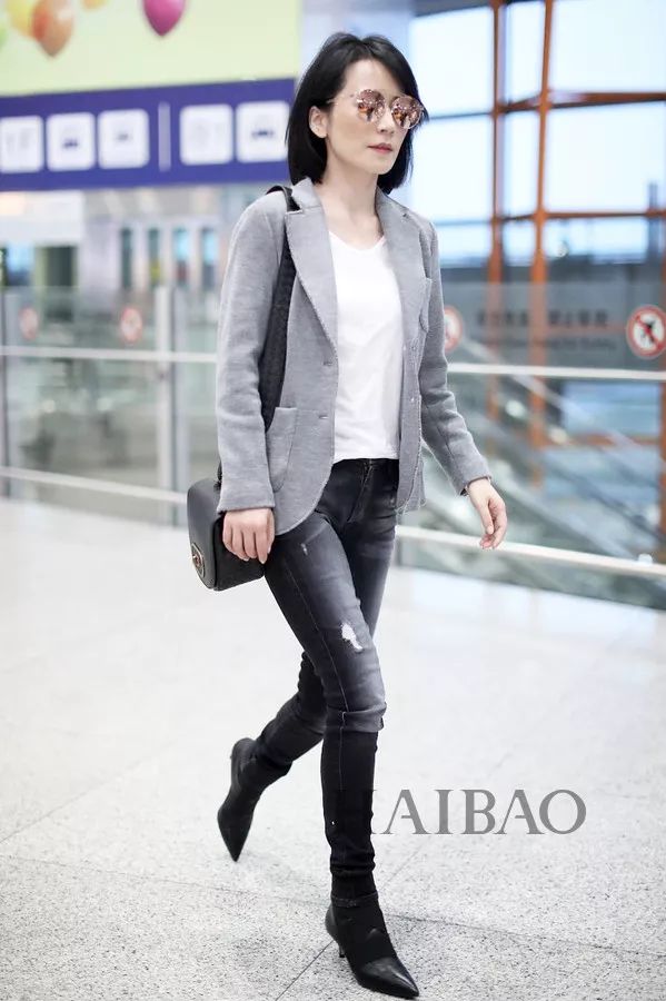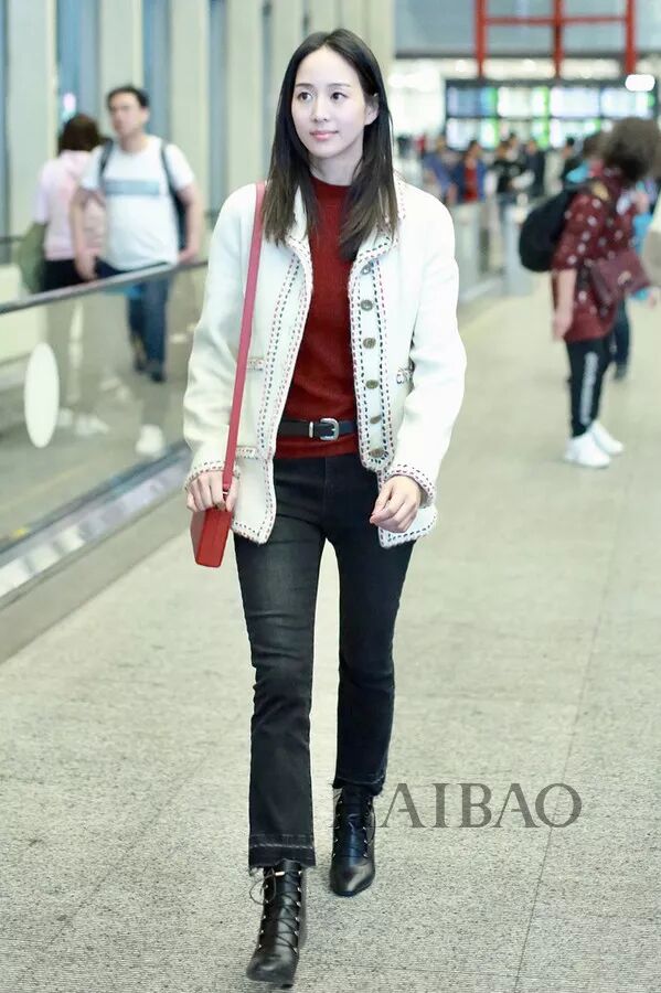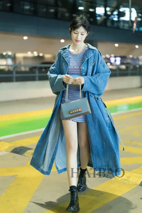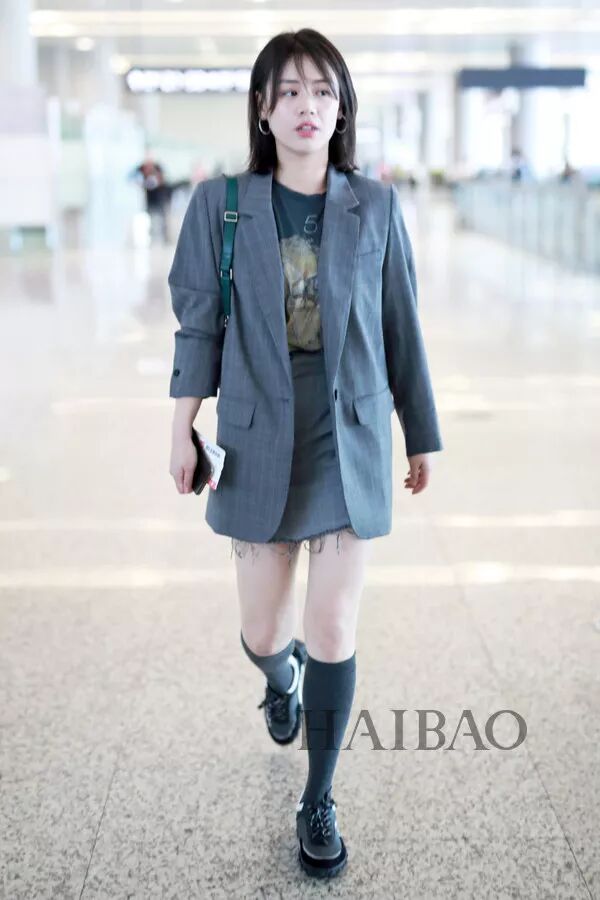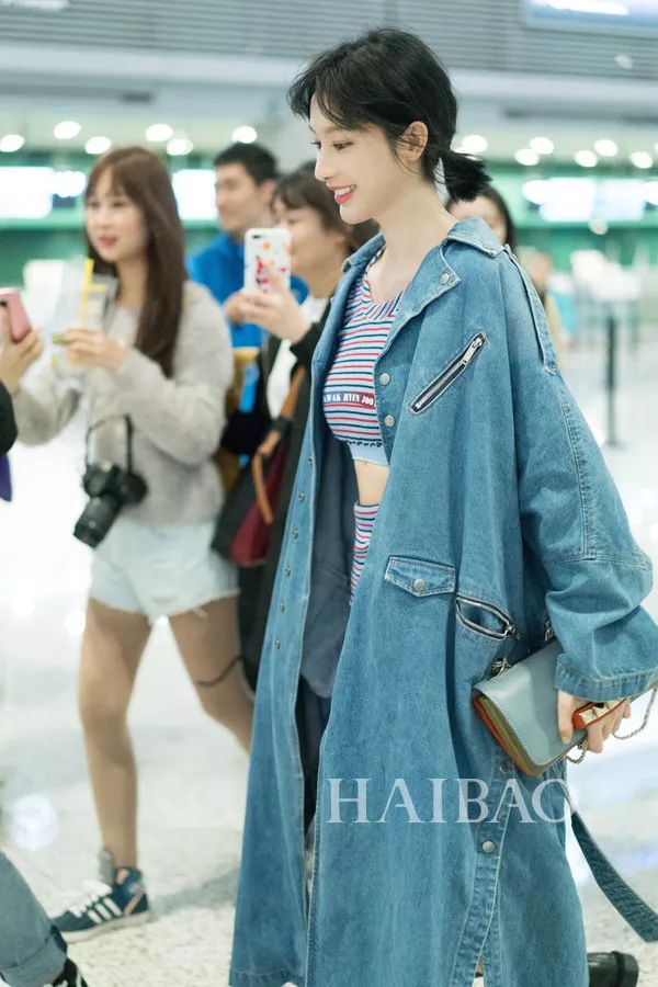 秦岚是靠牛仔短外套来拉高比例的,这种潮酷街头风的搭配真心不适合气质温婉的她,看上去生硬怪异。