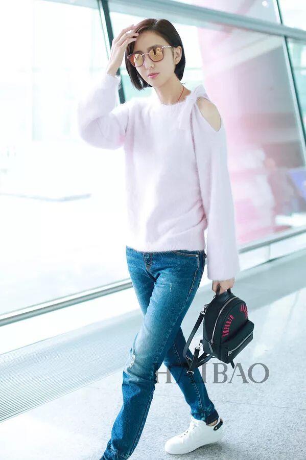 丫丫也穿了粉色的马海毛毛衣,单边露肩绑带的细节很别致,搭配牛仔裤,更率性一些。