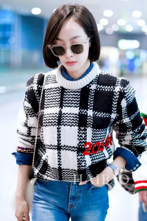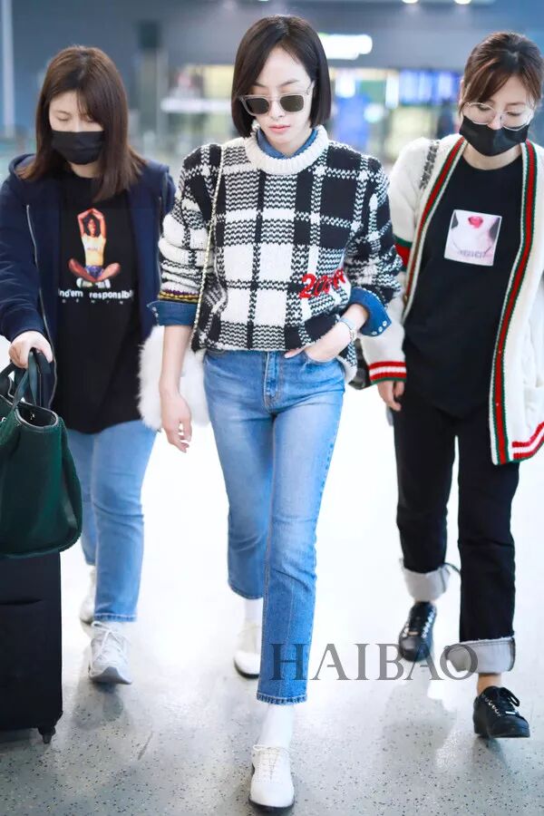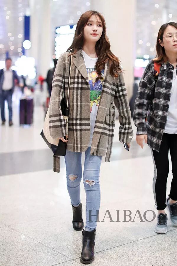 同样是格纹织花的毛衣,李溪芮挑的款式比较薄,颜色也偏暗,搭配更是松散沉闷,估计就是求个舒适吧。