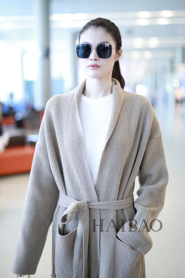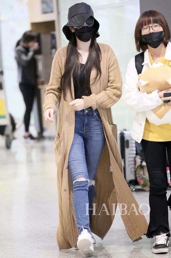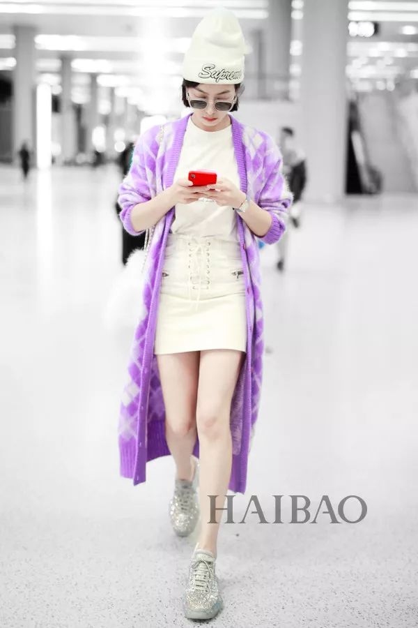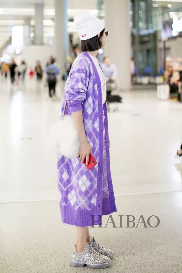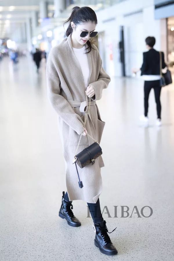 同样是长款针织开衫Look,热巴的搭配则应该列入反面教材,接近地面的衣长太吃身高,谁穿谁矮。