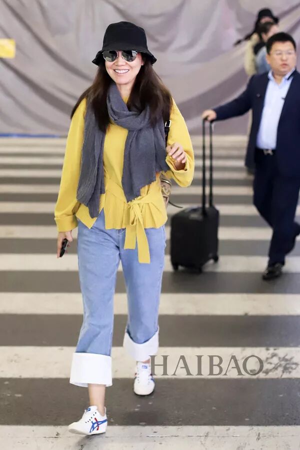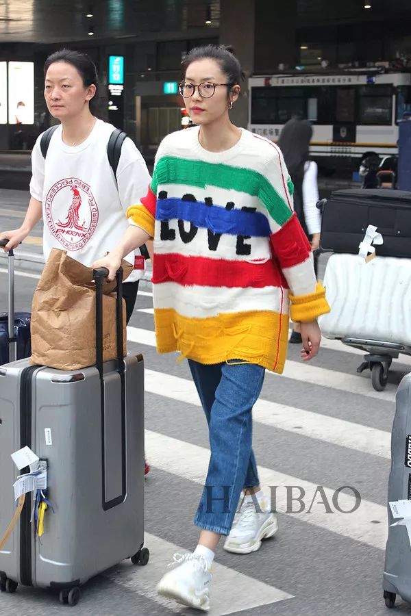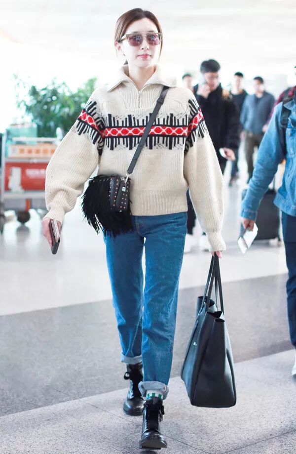 江疏影的翻领毛衣很特别,搭配卷边牛仔裤,随性而复古,很文艺范。