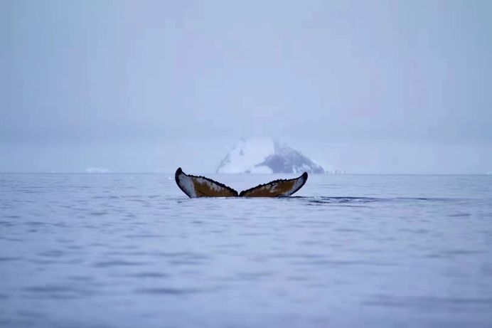 威尔米纳湾巡游那天,灯丝儿特别幸运地拍到了鲸鱼尾翻出水面,黑白黄三色相间的剪刀型尾鳍,在黑蓝色水面和白色浮冰的映衬下,清晰可见锯齿形纹路,引起团友一阵围观。