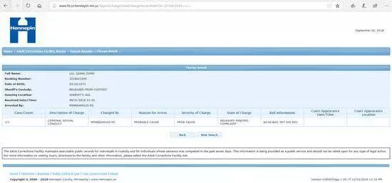 经过确实截图中所涉及释放信息真实存在于,美国明尼苏达州亨内平县政府官方网站中,网页中显示信息与网传一致,但其中被释放人生日信息为1973年3月10日,京东CEO刘强东在百度百科词条中生日则为1974年2月14日,两者日期并不相符