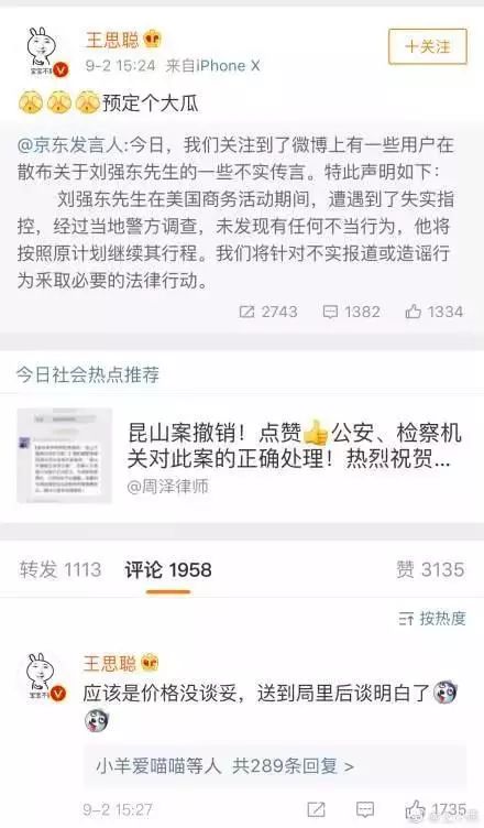 消息传开后京东发声明否认:“今日,我们关注到了微博上有一些用户在散布关于刘强东先生的一些不实传言。特此声明如下:刘强东先生在美国商务活动期间,遭遇到了失实指控,经过当地警方调查,未发现有任何不当行为,他将按照原计划继续其行程。我们将针对不实报道或造谣行为釆取必要的法律行动。 ”