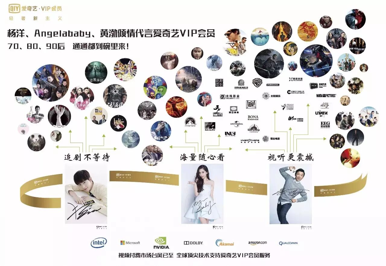 10月14日,爱奇艺VIP会员品牌全面升级,杨洋、Angelababy、黄渤成为爱奇艺VIP会员品牌代言人,对“追剧不等待,海量随心看,视听更震撼”的爱奇艺VIP会员品牌核心理念进行代言诠释。同时,爱奇艺宣布2016年起将投入超50%的资金和资源用于VIP会员业务。爱奇艺高级副总裁杨向华表示:“爱奇艺拥有中国最大规模的视频会员用户和丰富的影视资源,在中国视频会员服务爆发的风口,我们将以更大的投入服务于爱奇艺忠实粉丝,相信会员收入会逐渐成为中国视频行业主要的营收来源。”