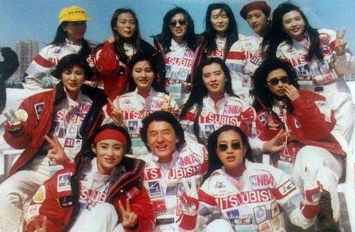 1993年,成龙杯慈善赛车会上,王祖贤、张曼玉、梅艳芳、张敏、叶倩文等人身着赛车手服与成龙合影。这张照片几乎涵盖了当时香港最红的女星。在所有明眸皓齿、皮肤白皙的女星里,有一个头戴红色贝雷帽,皮肤黑黑的姑娘站在张曼玉与邱淑贞之间,像个混入明珠里的假小子。