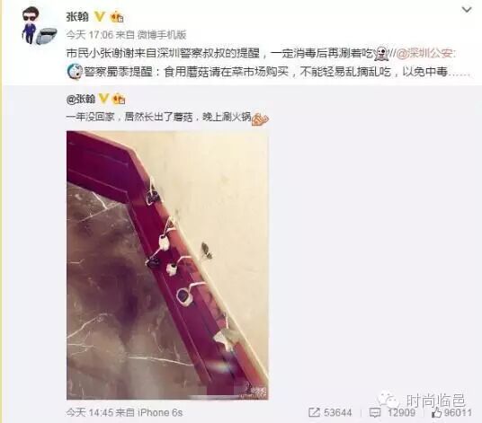 有趣的是,张翰发文后不久,就被深圳公安局官方微博转发,对方幽默呼吁“警察蜀黍提醒:食用蘑菇请在菜市场购买,不能轻意乱摘乱吃,以免中毒……”而张翰则再度回应:“市民小张谢谢来自深圳警察叔叔的提醒,一定消毒之后再涮着吃。”两方一来一往幽默互动,令粉丝大笑直呼太可爱。