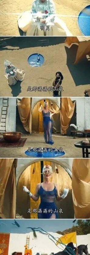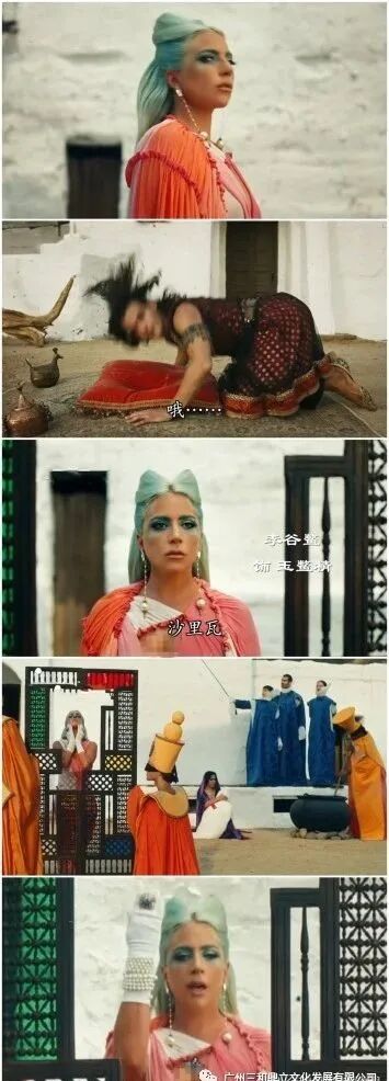 最后结尾的镜头也充斥着异域风情,飘扬的衣摆以及木桩上随风飘扬的绿丝带都为我们的视觉带来了一种飘逸的美感冲击,LadyGaga新歌MV值得一看,元素很多,中西结合,里面的梗也很多,如躺在沙子上眼睛被丝带蒙住,是不是让人想到了《神雕侠侣》中的小龙女?有一段时间这种躺下去长发摆成很美好的样子的视频走红网络,而这一次LadyGaga就很好的结合了这些美的元素,为我们带来了新的画面