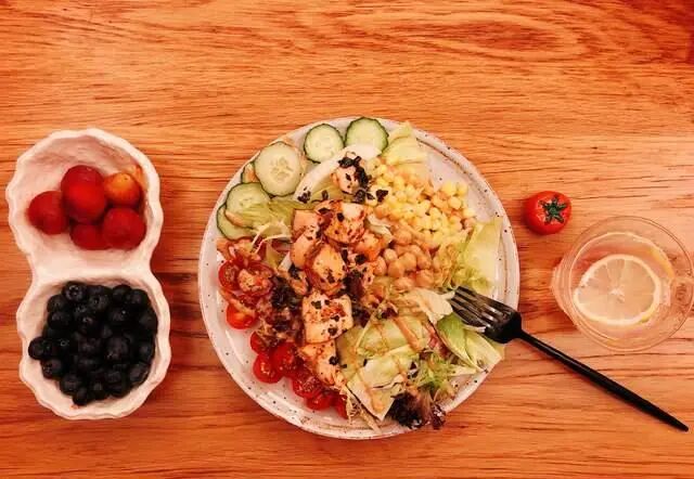 这是给老公做的爱心早餐,以高蛋白、高纤维、低热量为主,选用鸡胸肉、黄瓜、玉米、包菜、口蘑、虾仁,淋入芝麻酱制作成沙拉。搭配葡萄、小西红柿补充维生素,早餐喝一杯柠檬水,可以帮助身体排毒。