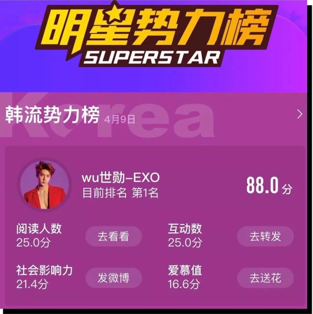吴世勋的红数字会说话:微博明星势力榜韩流势力排行第一。