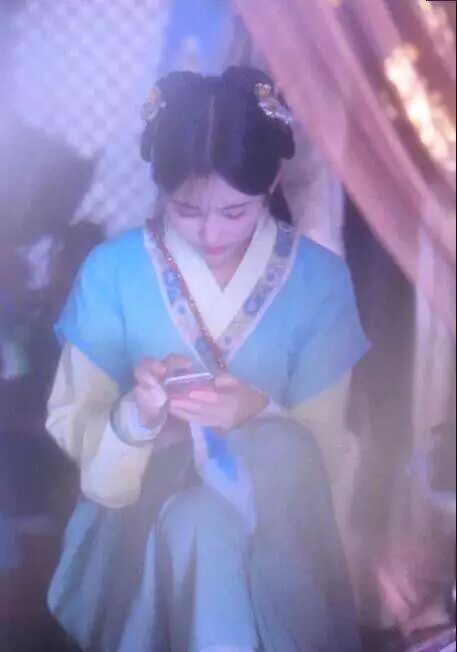 照片中,鞠婧祎身穿蓝色长袍,梳着古装长发,但是手里却玩着手机,穿越的感觉非常强烈。
