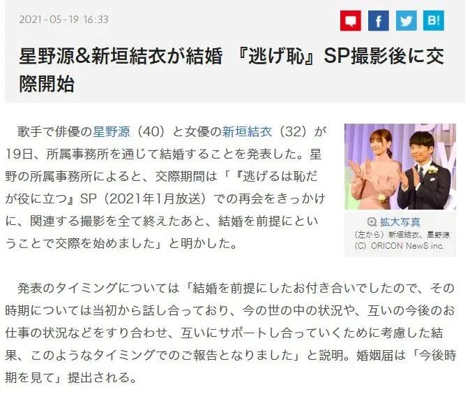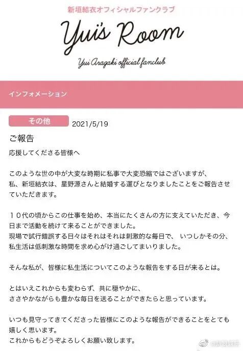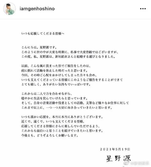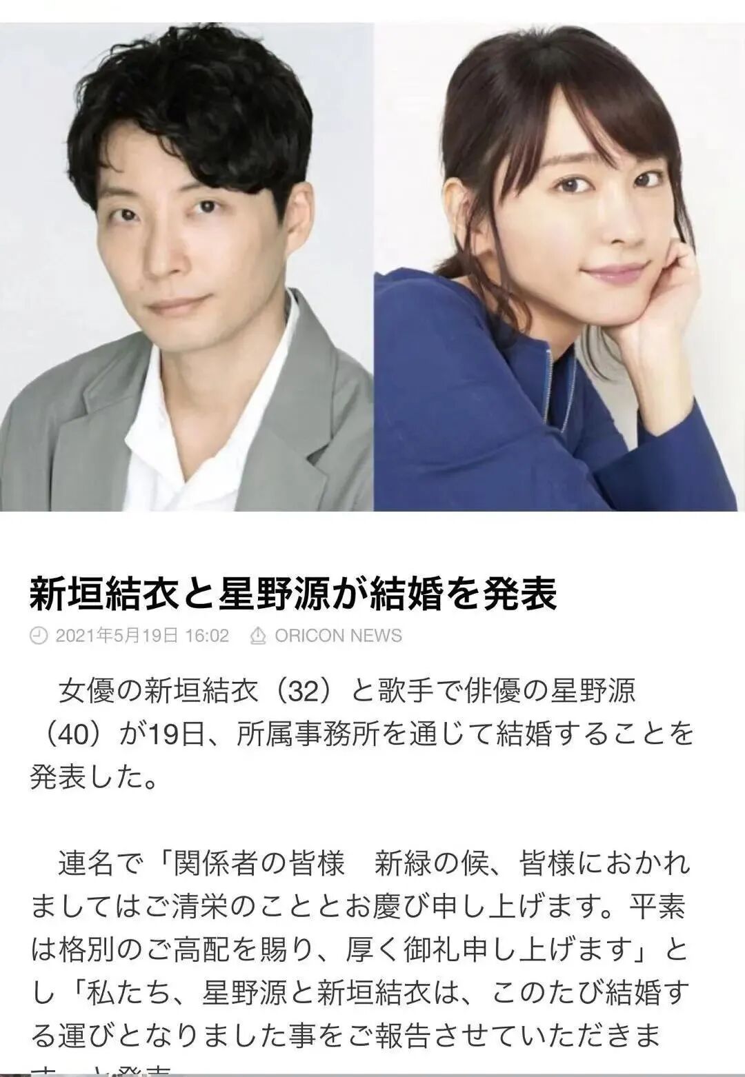 2021年5月19日,新垣结衣与歌手/演员星野源通过事务所公布结婚喜讯。