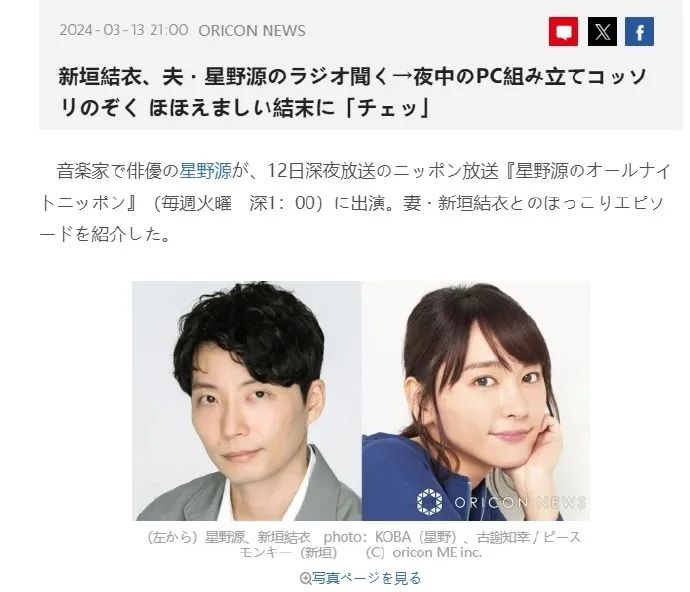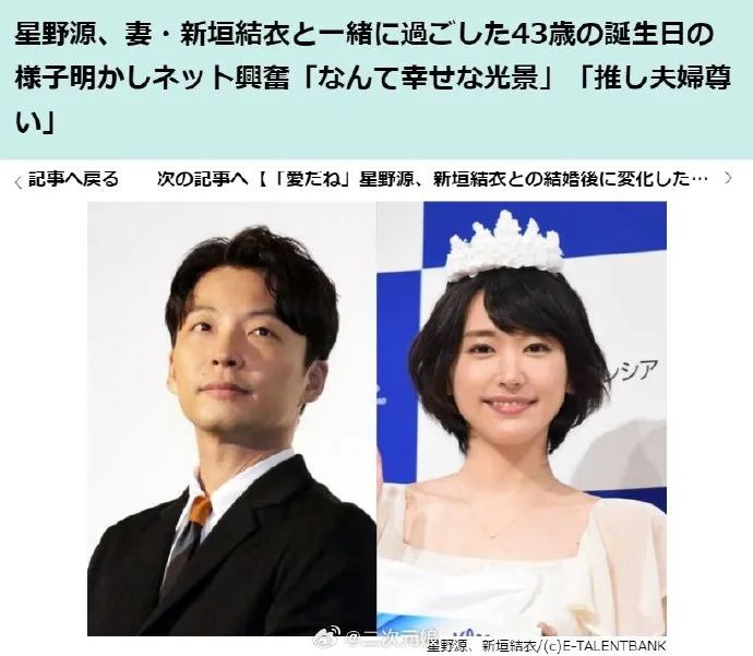 最近,星野源又给广大网友分享了新的夫妻小故事。