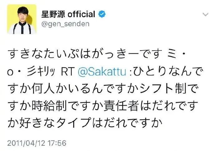 星野源2011年的回复也被挖了出来,他曾发推回复网友:“喜欢的类型是新垣结衣。”
