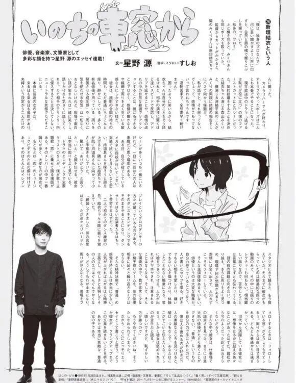 而星野源曾经在杂志"达文西"的连载"いのちの车窓から"里写过一篇文章:No.26 一个叫新垣结衣的人。