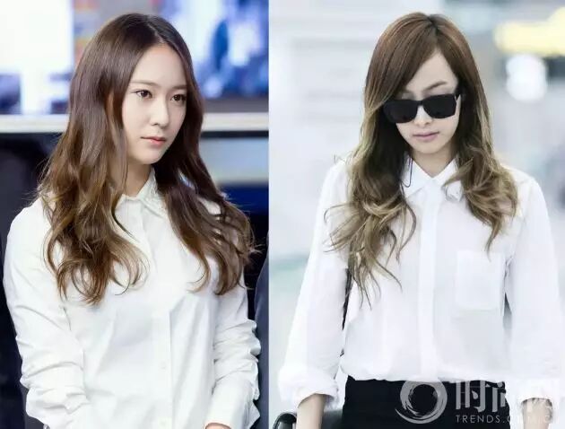水晶简约白 T & 黑色小脚裤配灰色西装,符合她一贯的帅气;宋茜选择了条纹西装,阔腿裤略显成熟了一些,姐姐范儿十足。果然水晶是被照顾的那一个啊~