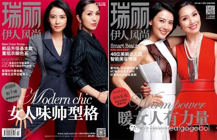 变成大众女神后越来越有挡不住的女人味,就常常跑去上白领最爱的《瑞丽伊人风尚》封面,还拽着春娇一起。