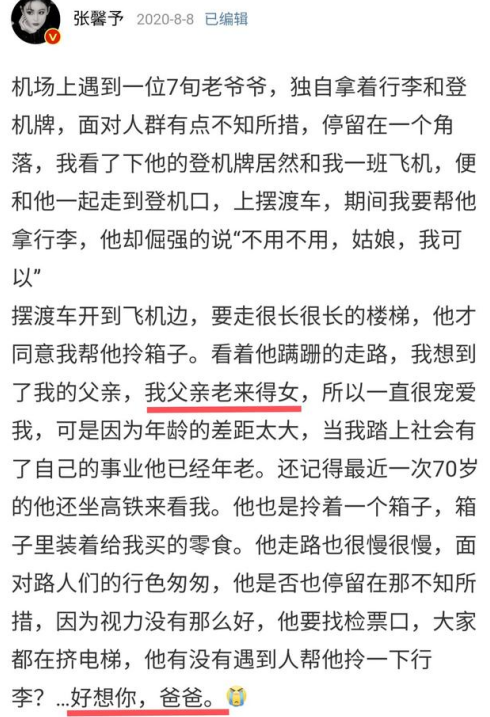 通过张馨予思念爸爸的文字,足以可见她与爸爸的感情是极好的,她自己也曾说过自己的爸爸是老来得女,因而对她也是十分宠爱的。在张爸爸的心里,可能张馨予一直是他捧在手心里的小公主吧。