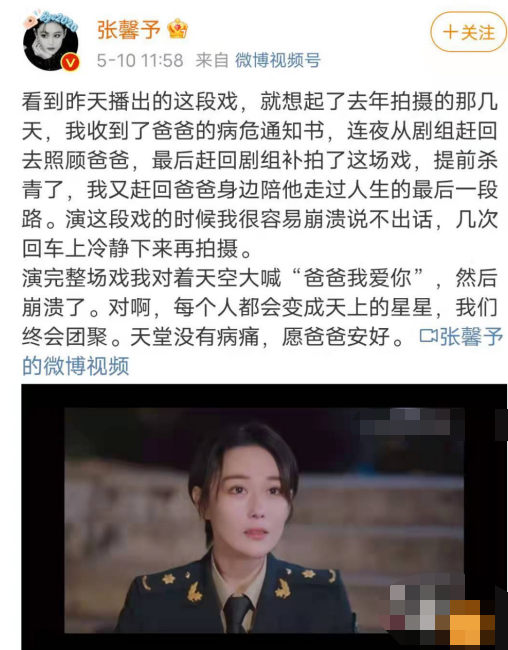 在发布视频的同时,张馨予还透露了在拍摄这段戏份的时候背后不为人知的伤心往事,原来在拍摄这场思念亲人的戏份的时候,张馨予恰巧收到了家中传来的父亲的病危通知书。
