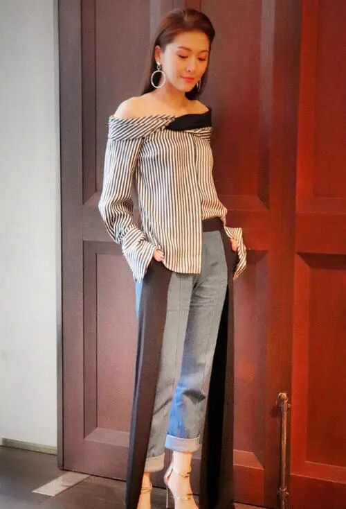整个人的五官看起来也会觉得特别的精致,而且上半身穿的又是一件衬衫,不过这件衬衫选择的是条纹的设计,并且把自己的肩膀还给展现出来了,下面穿的是一条牛仔裤,但是旁边还有一些黑色的线条,所以就不会显得比较的单一化。