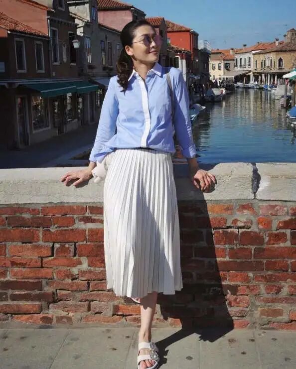 脸上就算没有化妆,而且把头发全部固定起来,也不会觉得有多么的衰老,因为皮肤状态看起来就会觉得特别的紧致,上半身穿的是一件衬衫,这件衬衫选择的颜色是蓝色,并且下面还搭配了一条白色的半身裙。就算脚上穿了一双白色的拖鞋,也不会觉得有多么的难看。