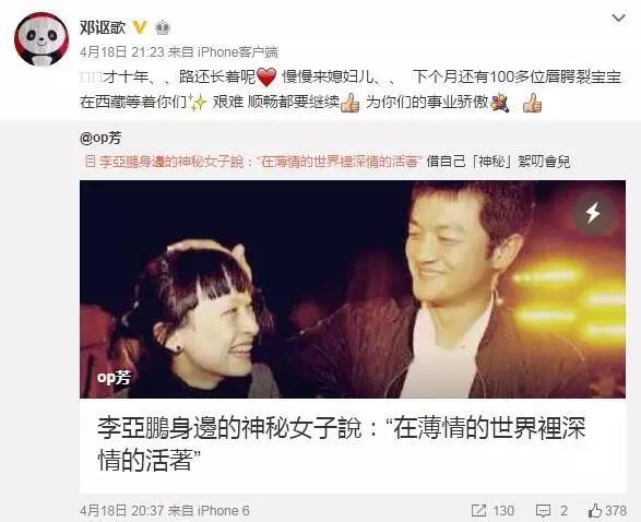 事后,该“神秘女子”发文澄清传闻,讲诉和李亚鹏认识全过程,称两人是事业伙伴关系。她的老公邓讴歌也转发长文,误会才得以解除。