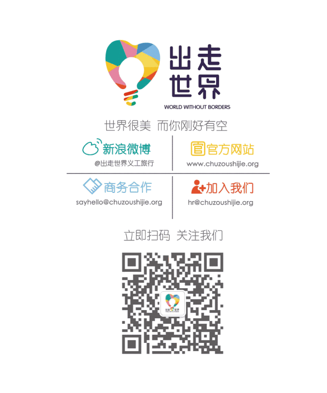 林一同学的分享,让我们想起了「出走世界」创立的初衷——希望更多人了解义工旅行,加入我们志愿者队伍,用自己的力量让世界变得更好。公益的道路上,我们需要这样有声的正能量,因为个人的力量是有限的,唯有获得更多人的支持,这条路才能走的更远。