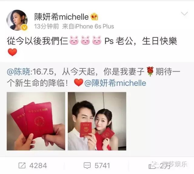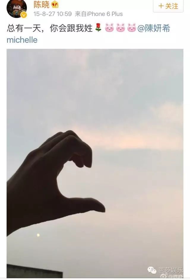 双陈恋公开的方式也是很特别,陈晓了一个手比心的图片,并说:”总有一天,你会随我姓!“公布了两人的恋情。